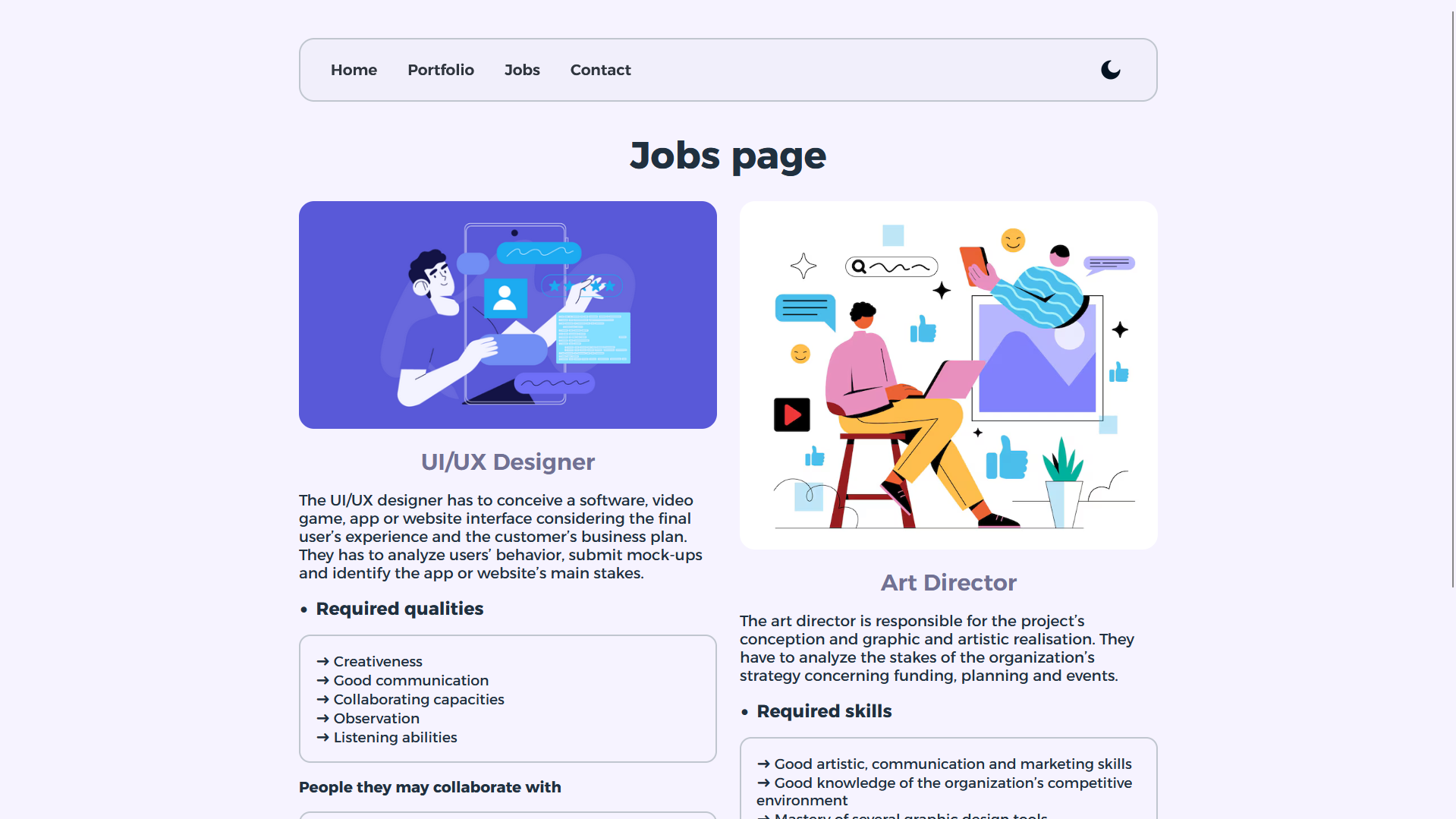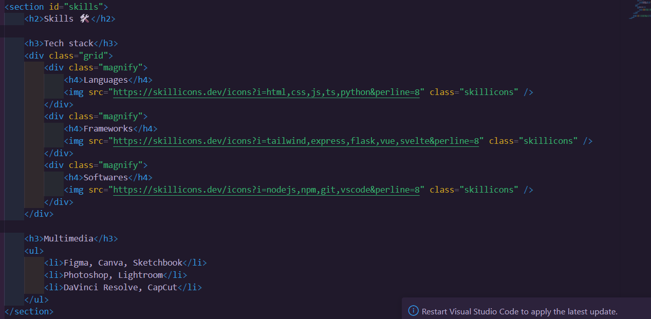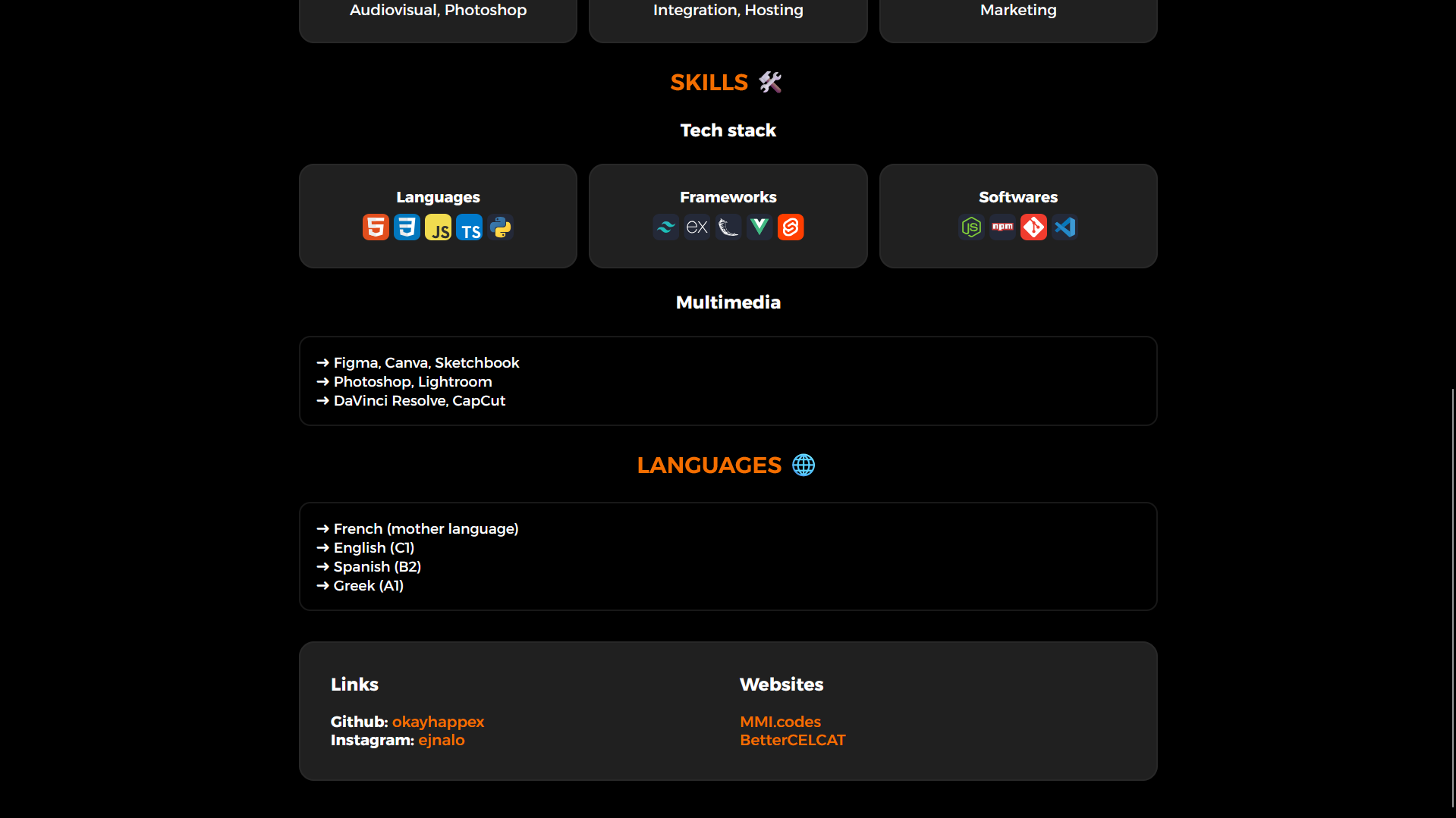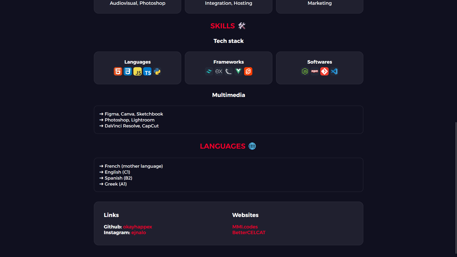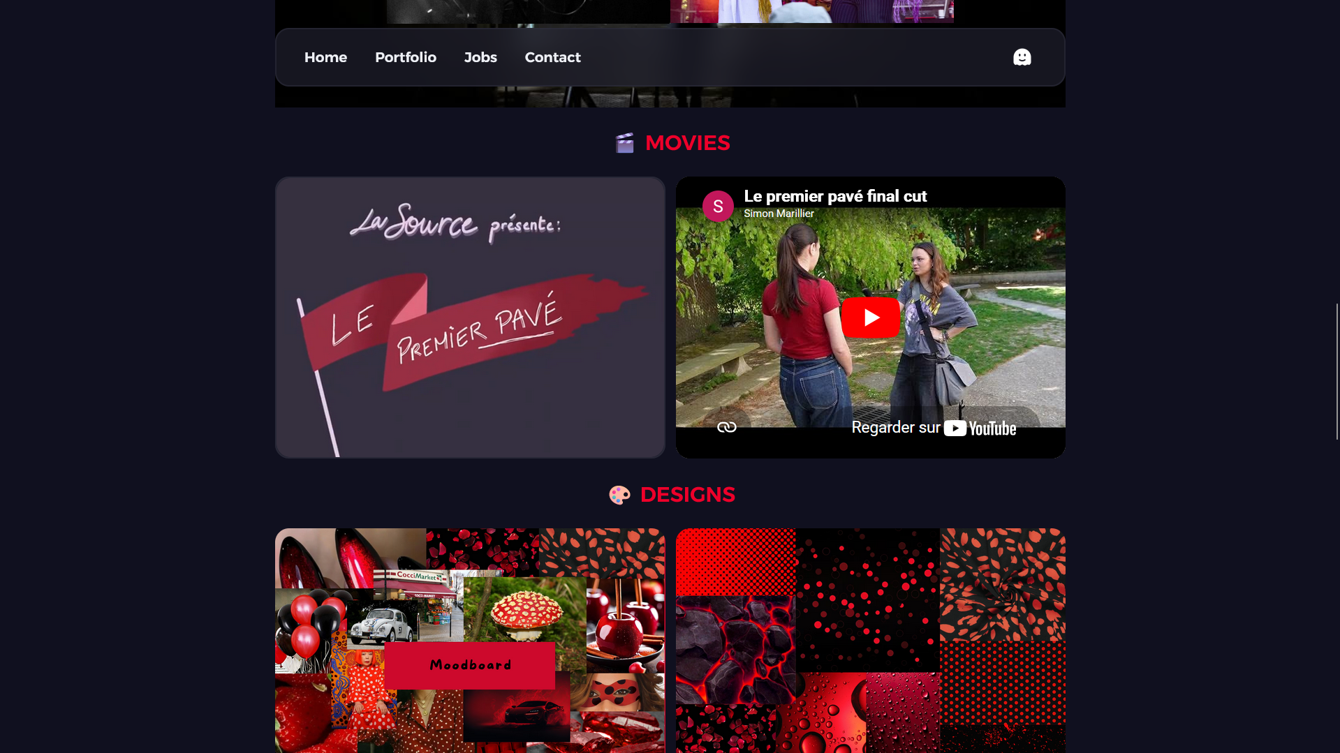 Une fois le CSS de base créé, j'ai commencé l'intégration du HTML. Je suis parti sur une structure en quatre page: une pour mon CV, une page portfolio, une page contact et une page où je décris deux des métiers dans lesquels je pouvais m'imaginer. J'ai égelement utilisé des animations CSS pour animer mon site et le rendre plus vivant et moins statique.